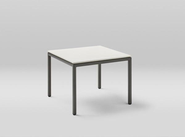 Square 70 x 70 cm corner table with powder-coated aluminium frame and adjustable legs. Aluminium finish in one colour: Metallic grey 56. Porcelain or compact top. Porcelain colours: Natural white 81, Light grey 80, Lava grey 82, Corten 83, Black 84. Compact colours: Beige and Black.
