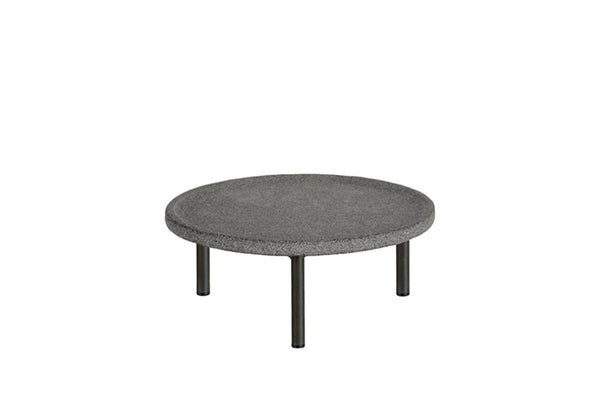 Side table 28 centimetres in diameter. Epoxy lacquered aluminium frame in Metallic Grey 56. Bush-hammered granite top in grey.